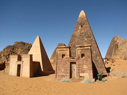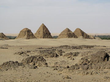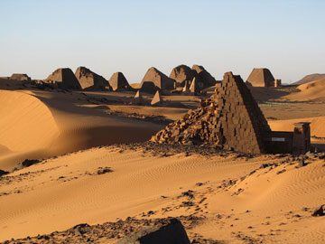We cross the Nile and make a brief visit to the ruins of the mediaeval Ghazoli Monastery. We then enter the Bayuda Desert, an area bounded by the loop formed by the Nile between the 4th and the 6th Cataracts. It is characterised by black basalt mountains, alternating with level pebble stretches and large dry wadis. We may meet an isolated camel and donkey caravan of the Bisharin nomads. After lunch we cross the Nile near Atbara and proceed southward to Meroe. Here we arrive around sunset to see the stunning sight of 40 pyramids spread out over two low ridges. We check in to our new accommodation at the Meroe permanent tented camp.