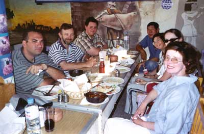 The September 2003 group in a café at Luxor: Amr, Paul, George, Keith, Linda, Laura and Lindsay