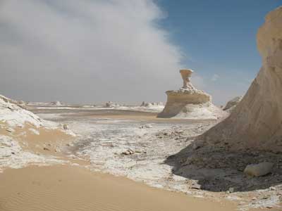 A short drive by 4-wheel drive north of Farafra took me to the White Desert. Formed by the wind erosion of a layer of white limestone overlying Nubian sandstone, the landscape is stunningly beautiful and strangely alien. It really finds no parallel with any landscape I have seen before. The forthcoming tour of the Oases in February 2009 will include a visit to Farafra and an overnight camping trip in the midst of the White Desert - I think the group will really enjoy the experience of seeing this remarkable desert in all its stunning glory at both sunset and sunrise.