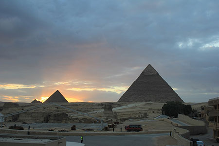 I collected my group on the afternoon of the 7th February - after they checked into the hotel we had dinner at a restaurant near Giza which has a superb view of the pyramids - we saw a spectacular sunset directly behind the pyramids. The following day we began our tour. We went to Memphis (Mit Rahina), one of the ancient capitals of Egypt, where we stopped to see the ruins of the Temple of Ptah and explored the on-site museum which has some remarkable sculpture including the famous colossus of Ramesses II. We then drove to the desert plateau at Saqqara where we descended into the burial chamber of the pyramid of King Tety of the 6th Dynasty. We explored the beautiful painted reliefs of the tomb of the Vizier Mereruka. Stephanie rode a donkey to the Serapeum (the resemblance to Gertrude Bell was uncanny!). We saw the sarcophagi of the mummified Apis bulls, newly restored and now well lit. We also explored the paintings of the tomb of Ti and then walked through the Step Pyramid complex of Djoser before walking to see the tombs of Maya and Horemhab - the burial chamber of Maya is particularly stunning.