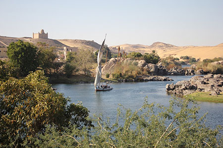 The following day was spent on a felucca (a single masted sailboat) exploring the beautiful monuments and scenery of Aswan. We crossed the Nile and then climbed up the many stone steps to the ancient necropolis where there are painted tombs of the 6th and 12th Dynasty. A Spanish mission was excavating some tombs on the terrace and invited us to look at what they were uncovering. There was a stunning view over the city. We returned to our felucca and then sailed to Kitchener's Island, the botanical garden of Aswan. The bougainvillea were out in all their glory. We stopped on the west bank and some of us walked (while others took camels) to St Simeon’s Monastery - we got an excellent guided walk round the complex. We had a late lunch at the Nubian restaurant on an island in the Nile. In the evening we went down to the Victorian Period Old Cataract Hotel and had a drink or two on the terrace.