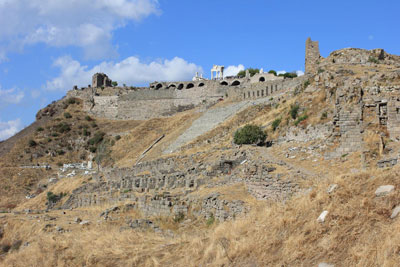 The next day, the 8th October, we headed north of Selcuk, saying farewell to our wonderful hosts at the Nazar Hotel. We stopped in Izmir to have morning tea with our guide Sijkin’s family - we had a very warm welcome and far too much food (delicious though!). We then continued out journey north, arriving in the city of Bergama, our base for 2 nights. Here we toured the superb ruins of the Hellenistic period - the site is now reached by using the new cable car which takes visitors up to the summit. The weather was stormy and very windy but somehow the rain held off for our visit. We walked down via the houses with mosaics and the superb gymnasium. We also saw the Temple of Serapis, the Asklepieion medical centre, and the local Museum. There was good shopping in Bergama.